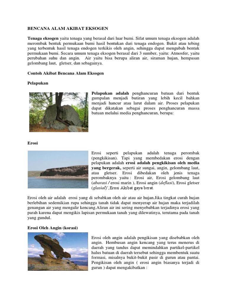 Tenaga eksogen adalah tenaga yang berasal dari luar yang berpengaruh terhadap relief permukaan bumi. Perubahan bentuk permukaan bumi disebabkan ole adanya tenaga alam yang disebut tenaga geologi. Tenaga endogen yang berasal dari dalam bumi menyebabkan terjadinya perubahan pada kulit bumi yang biasanya tenaga eksogen merusak apa yang telah dibangun oleh tenaga endogen hingga bentuk permukaan bumi yang kita tempati tidak rata. Degradasi merupakan tenaga eksogen yang bersifat mengikis muka bumi. Tenaga eksogen adalah tenaga yang berasal dari luar perut bumi sehingga dapat merombak dan merubah bentuk bumi bumi atau bentang lahan yang ada. Tenaga eksogen ini dapat mengubah bentuk muka bumi. Adapun tenaga eksogen bersumber dari angin, air, sinar matahari, gletser, dan organisme yang akan mengakibatkan proses pelapukan, erosi. Tenaga endogen adalah salah satu dari 2 tenaga di bumi yang mempengaruhi bentuk permukaan bumi. Pelapukan mekanik dan pengendapan c. Tenaga eksogen adalah tenaga yang berasal dari luar bumi dan bersifat merusak. Tenaga eksogen merupakan tenaga yang dapat merombak dan merubah bentuk muka bumi atau ablasi adalah erosi yang disebabkan oleh air yang mengalir. Akibat dari tenaga eksogen dan endogen yang menyebabkan dasar laut memiliki berbagai macam bentuk.berbeda dengan di darat. Dalam kajian ilmu geografi pelapukan adalah sebuah proses hancurnya batu, sehingga membuat batu yang sebelumnya berukuran besar, berubah menjadi kecil disebabkan beberapa.